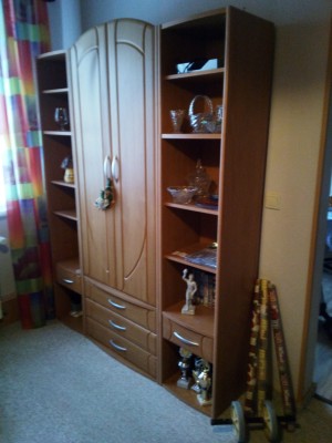 190 cm hoch, unterer Teil (Schubladen) bei 47,5 cm trennbar; Seitenregale 39 cm breit, Mittelschrank 74 cm breit, ca. 30 cm tief