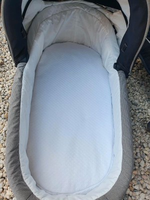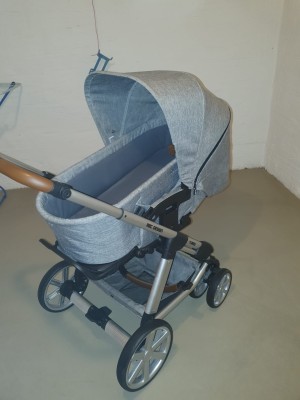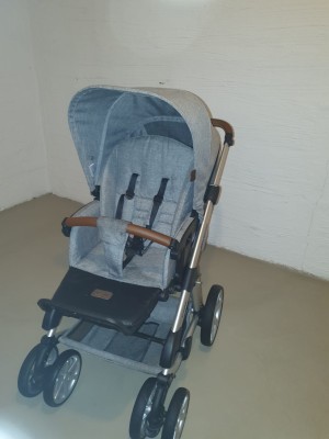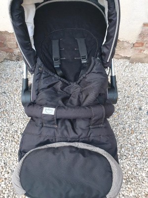Gepflegt, aber mit Gebrauchsspuren. Funktional. Feststellbremse. Vorderen Räder sind schwenkbar. Beinablage absenkbar. Moskitonetz und Regencape (nicht original) für Babywanne.
