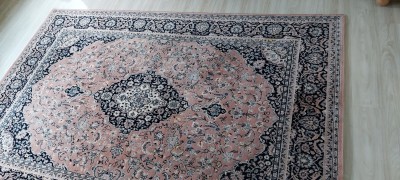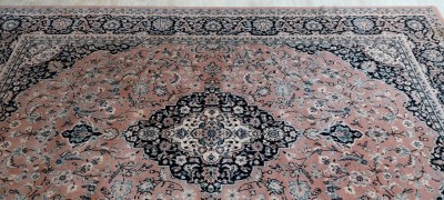 Großer Teppich aus 100% Schurwolle in den Farben altrosa/blau/grau