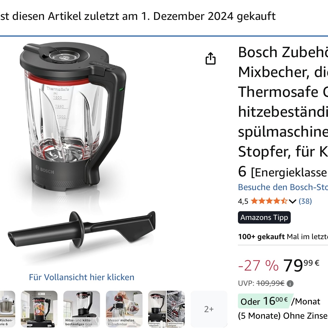Bosch Zubehör MUZS6MX, Mixbecher, dickwandiges Thermosafe Glas, 1,5l, mit Stopfer, für Bosch Küchenmaschine Serie 6