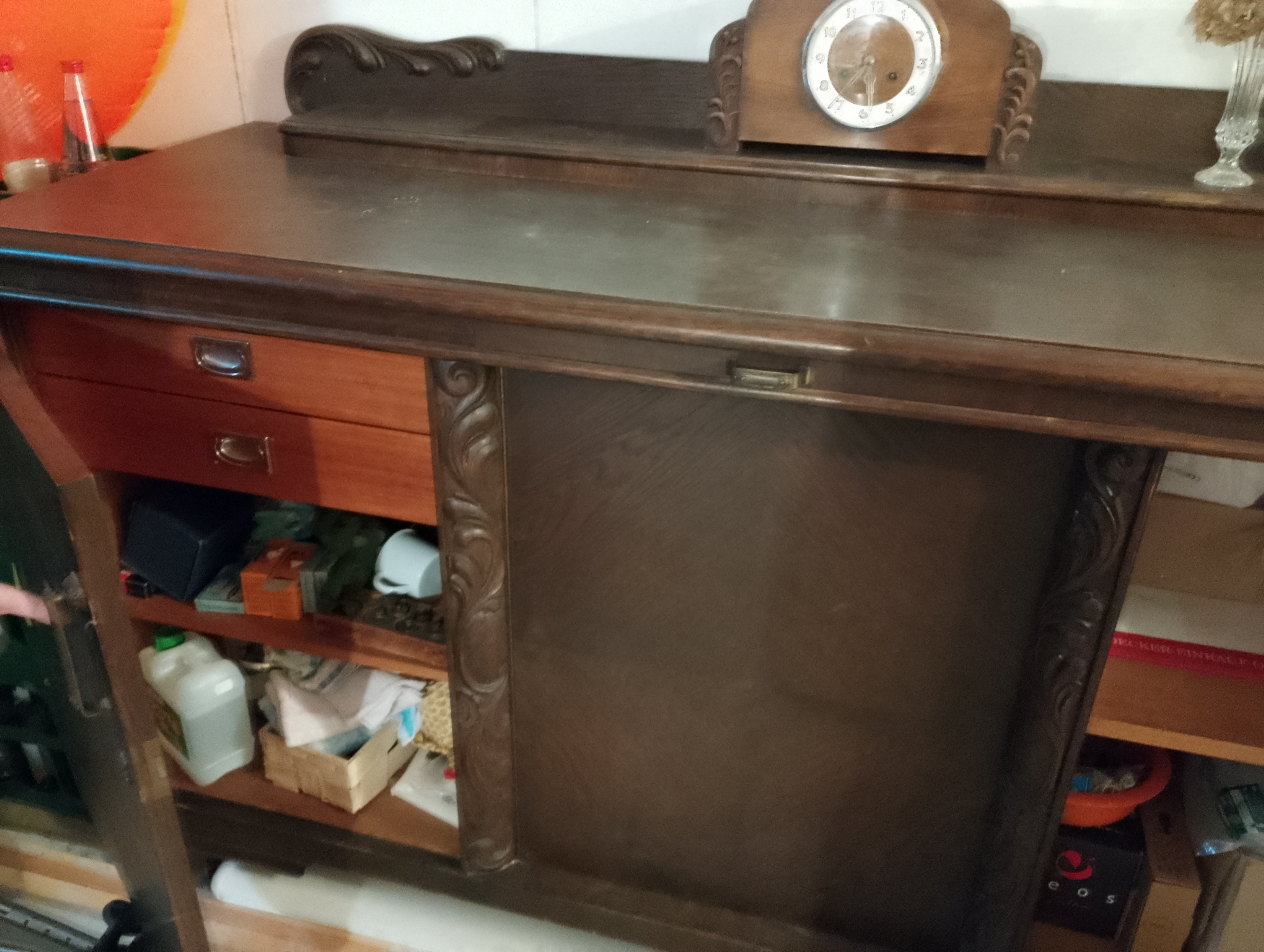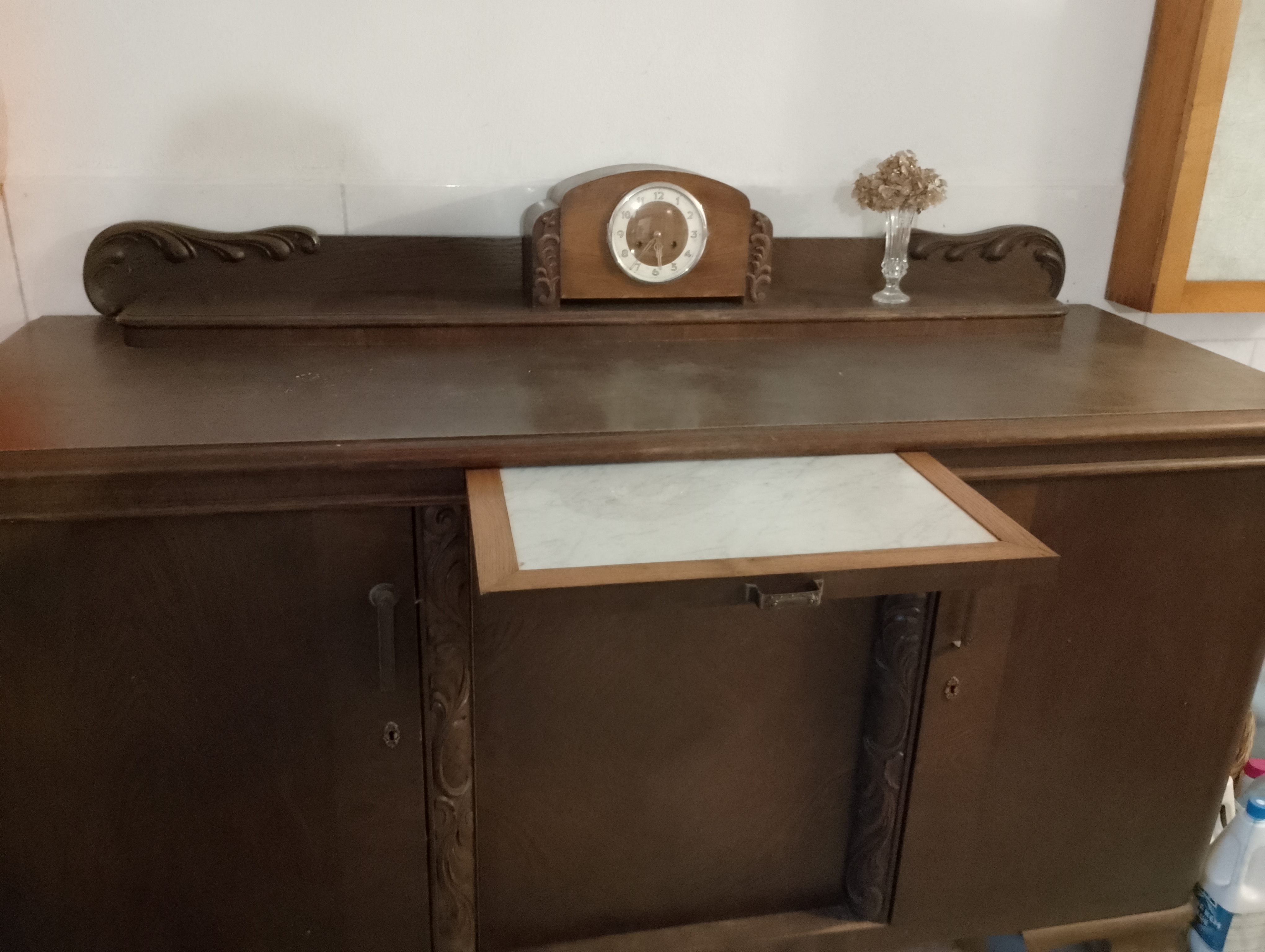 Stubenschrank ca. 1930-erJahre, dunkelbraun mit geringen Verzierungen, Marmoranrichteplatte, Vollholz, Maße: 190x65x100 cm kostenlos abzuholen