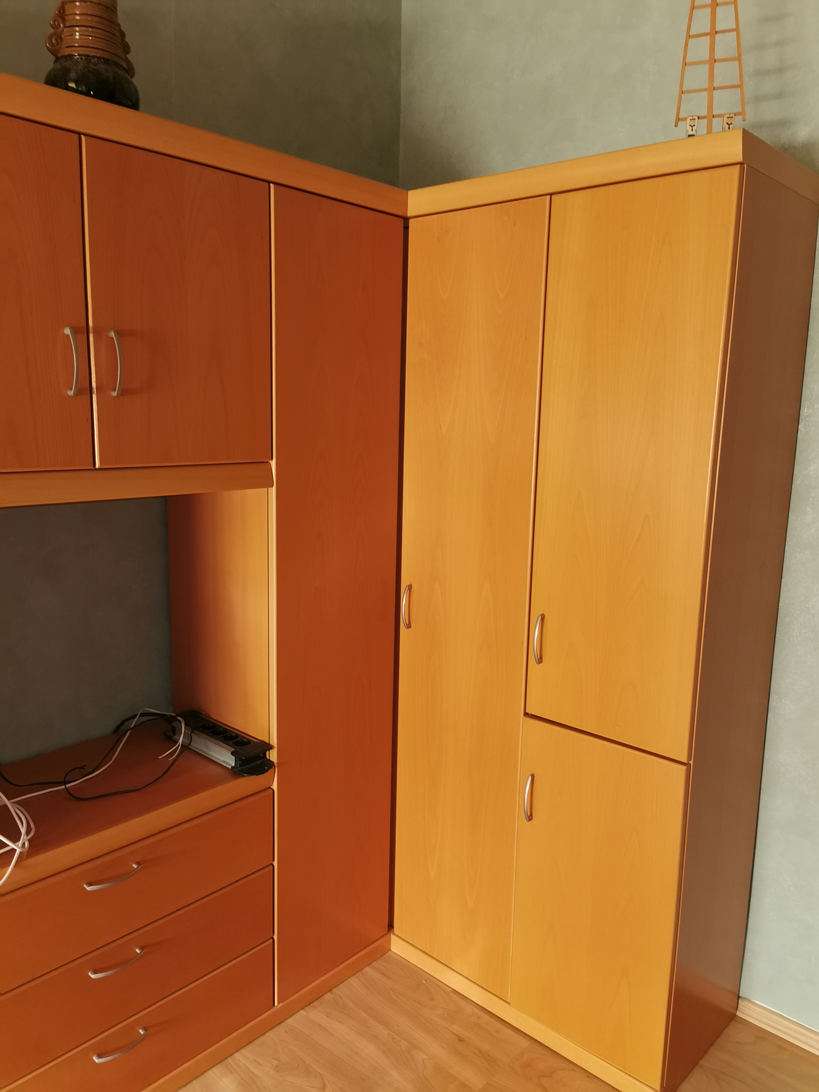 Kleiderschrank: 192 hoch, 80 breit, 60 tief; Glasteil: 186 hoch, 60 breit, 39 tief - nach vorn leicht gewölbt; Klappfach-/Eck-/Medienschrank: 106 hoch, 70 breit, 39 tief; plus Beistellregal; leichte Gebrauchsspuren, Abholort: Auma; 100,00 Euro VB