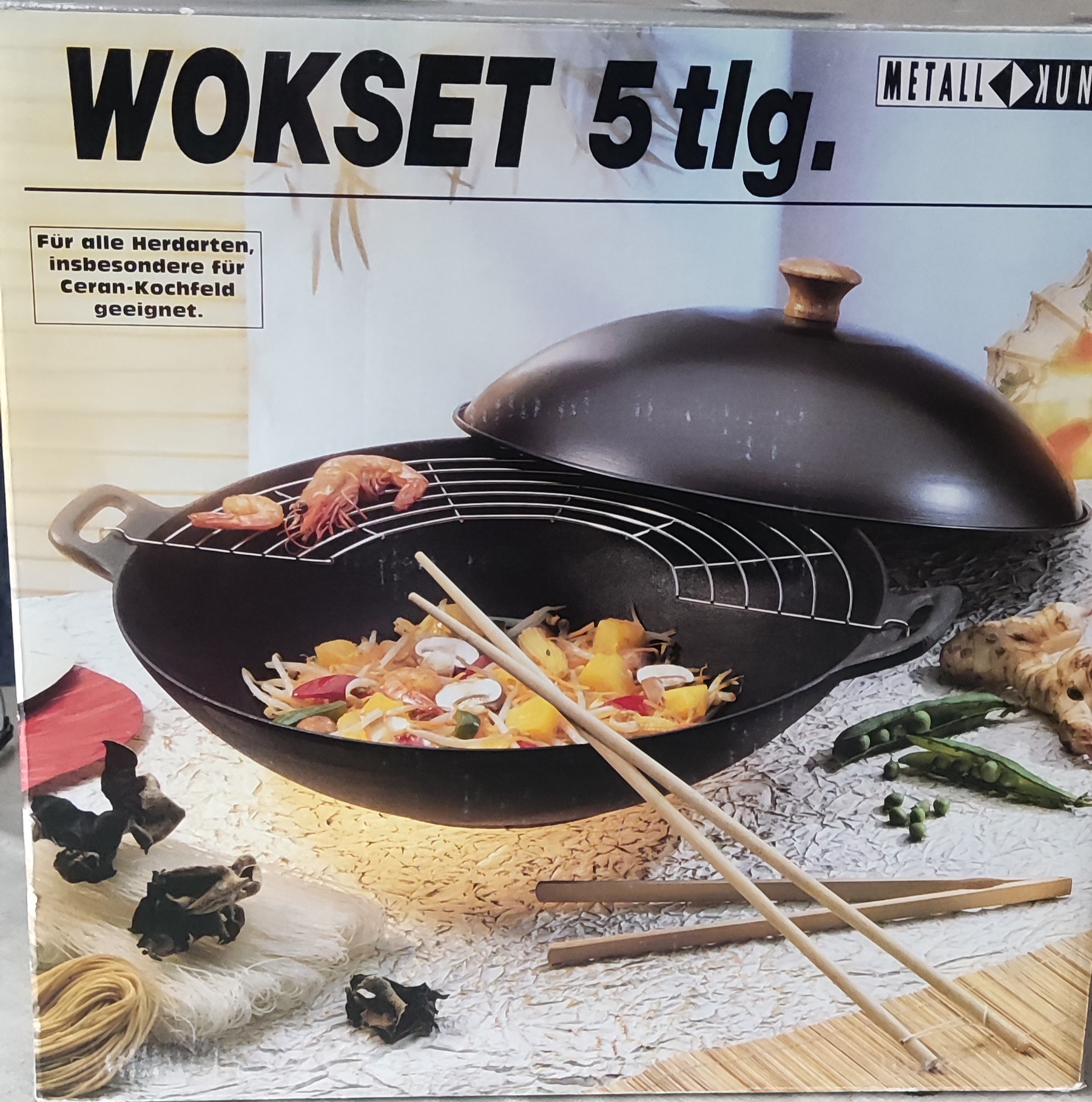 Verschenke 5teiliges Wokset (Gußeisen, emailliert, 36 cm, Deckel antihaftbeschichtet, Tepurarost, Servierstäbchen, Zange) sehr gut erhalten - Selbstabholung
