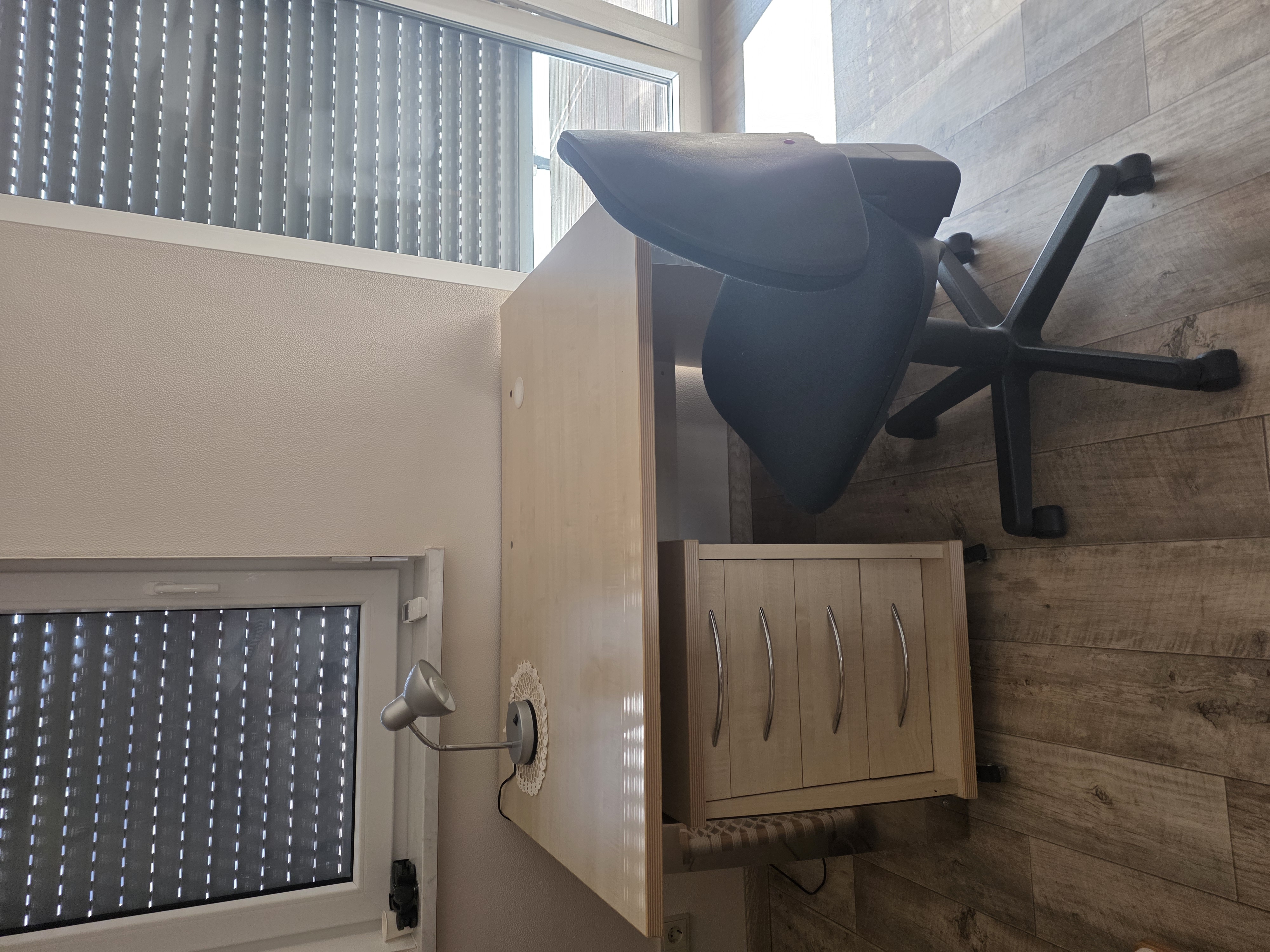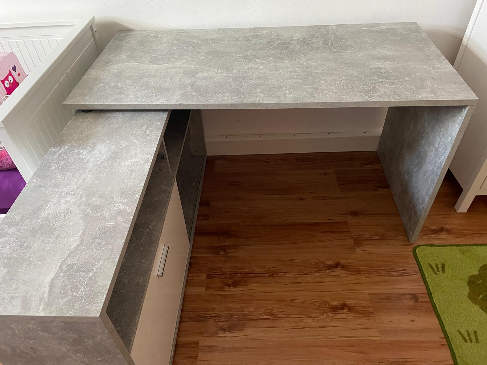 sehr gut erhaltener großer Schreibtisch, betonfarben mit weißer Schiebetür, Schubfach oberhalb dieser Tür ist vorhanden.