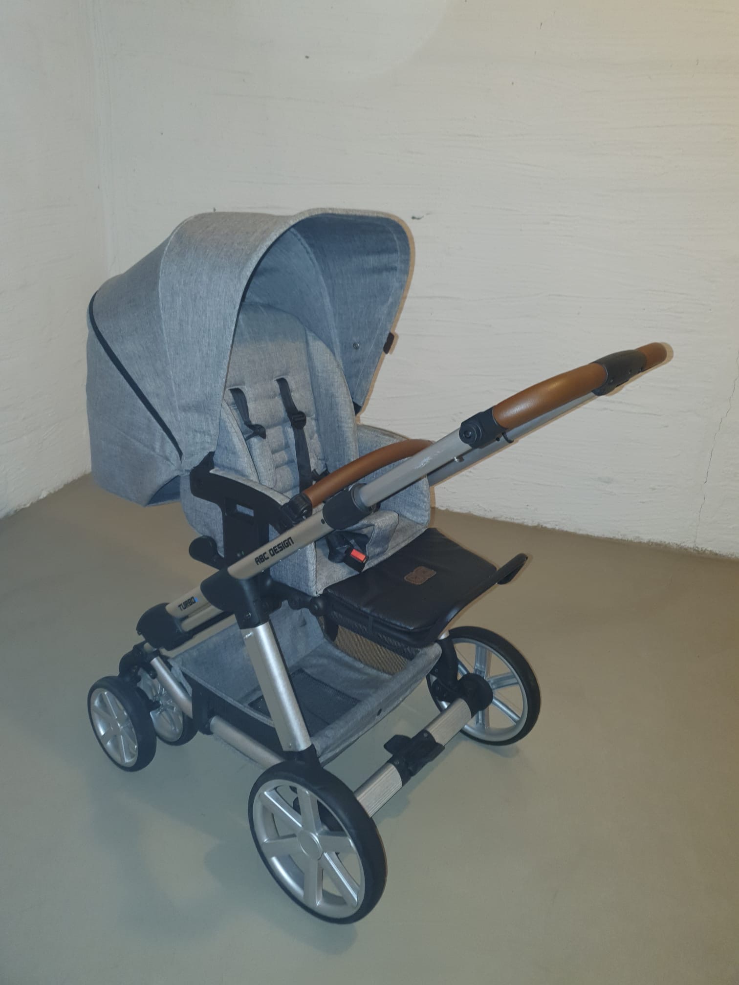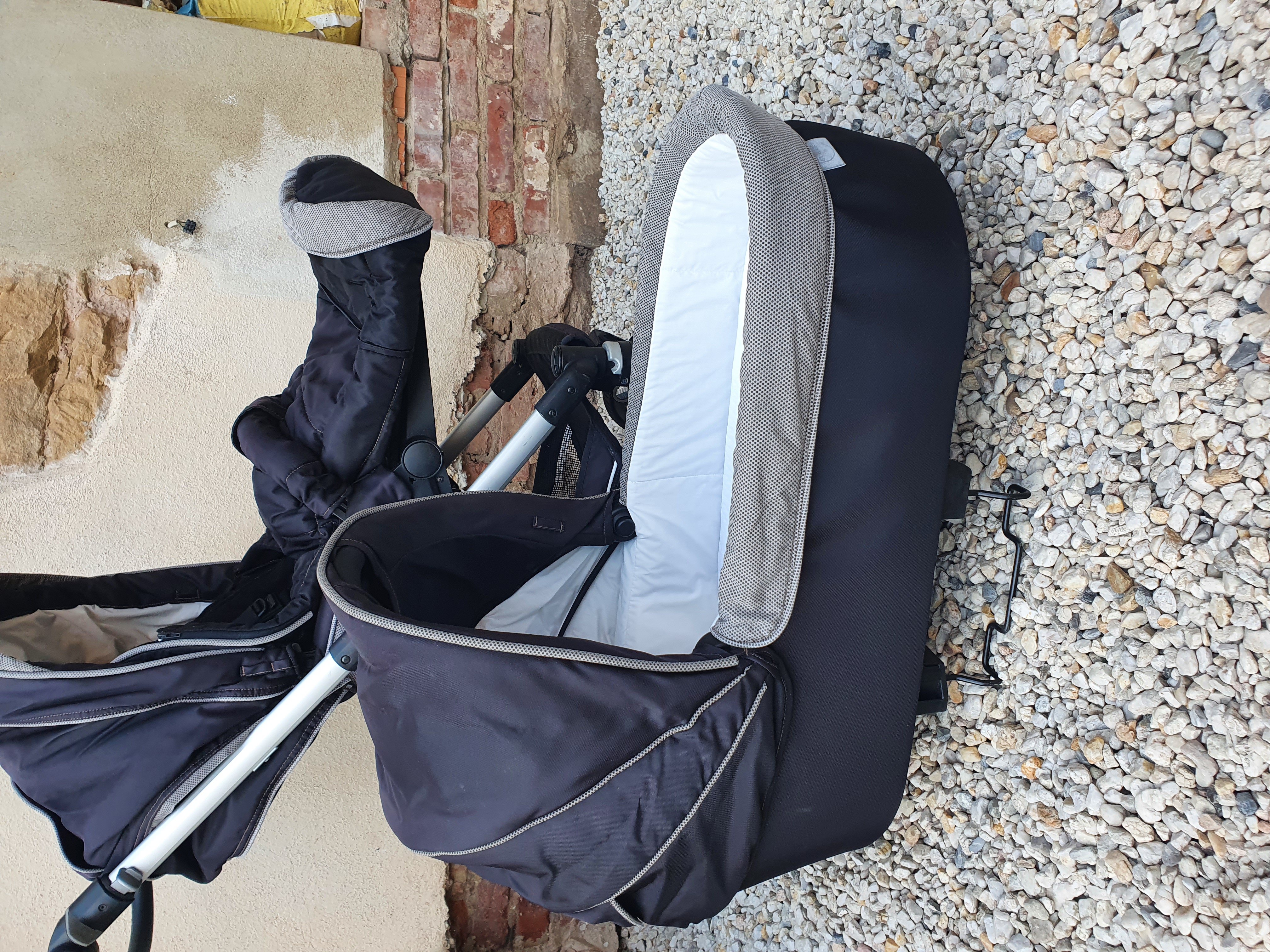Gepflegt, aber mit Gebrauchsspuren. Funktional. Feststellbremse. Vorderen Räder sind schwenkbar. Beinablage absenkbar. Moskitonetz und Regencape (nicht original) für Babywanne.