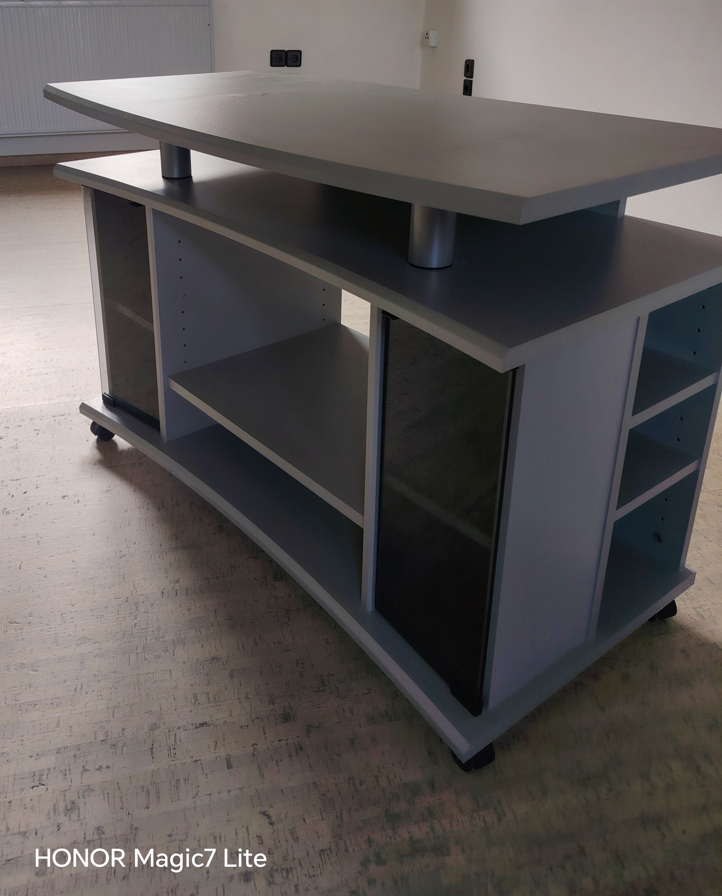 TV-Schrank auf Rollen, mit zwei Glastüren und Einlegeböden an den Seiten.