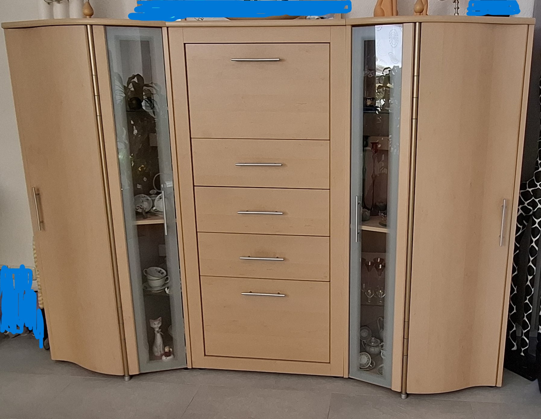 *große Vitrine, bestehend aus 3Teilen, große Fächer an den Seiten,Schubfächer u.Barfach,