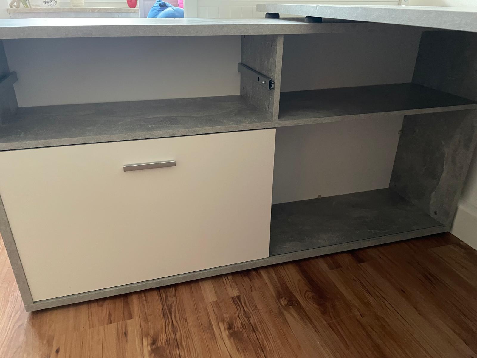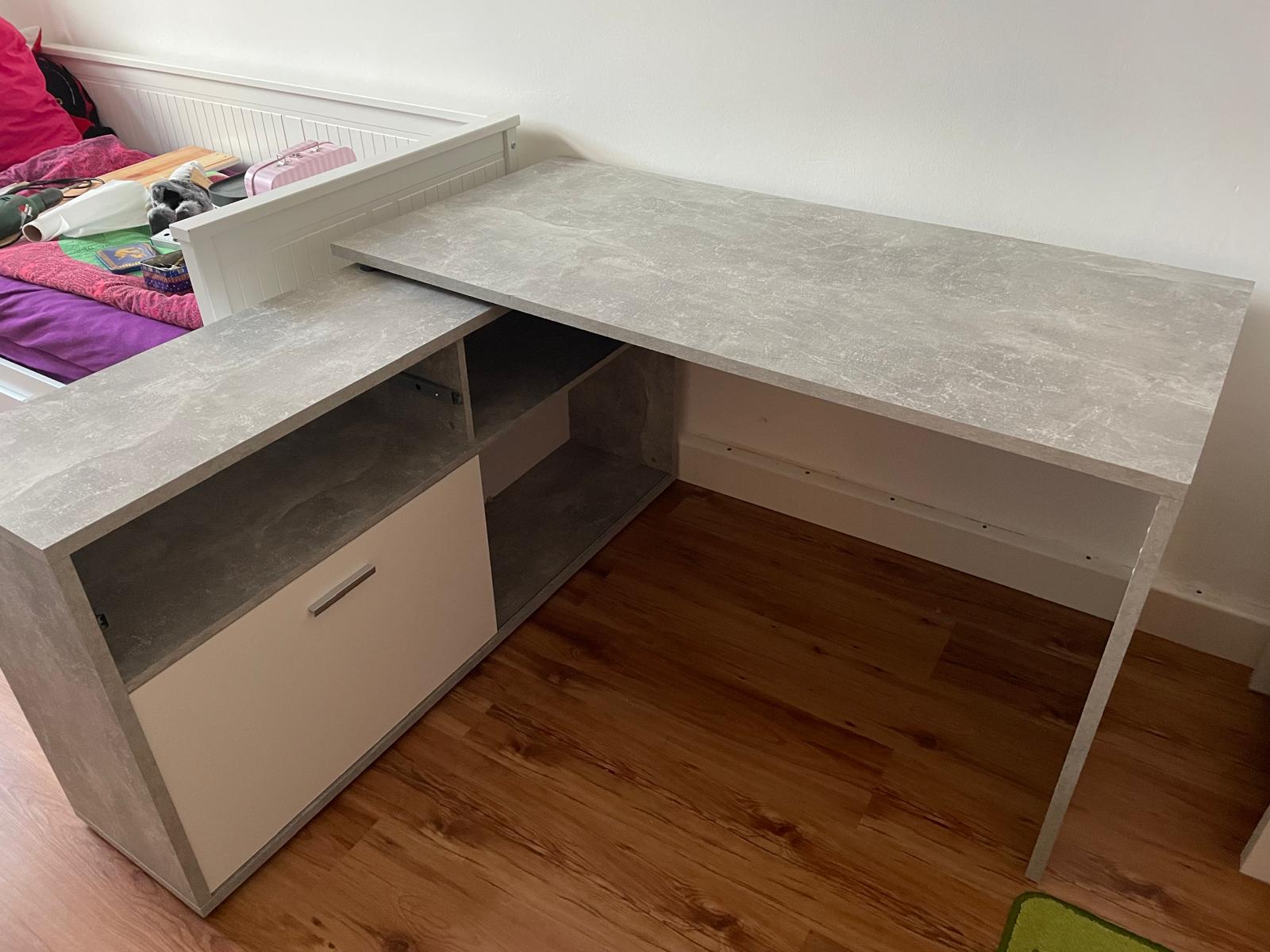 Sehr gut erhaltener großer Schreibtisch, betonfarben und weiße Schiebetür, Schubfach oberhalb dieser Tür ist vorhanden.